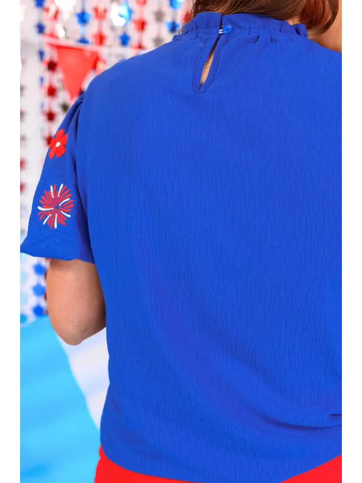 Feel like royalty this summer with our Patriotic Princess Embroidered Top. With textured embroidery of stars, flowers, and fireworks on the sleeves, you'll stand out in any crowd. The back button closure adds convenience to the style. Show off your patriotic side with this unique top.